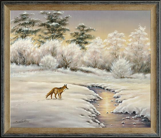 Gemälde / Fuchsgemälde: Fuchs, Winterfuchs, Fuchsbild, Fuchsbilder, Fuchsgemälde, Winter, Schnee, Landschaft, Winterlandschaft, Schneelandschaft, Wintergemälde, Winterbild, Winterbilder, Bach, Bachlauf, Frost, Eis, Eisdecke, Eisschicht, gefroren, zugefroren, Winterbach