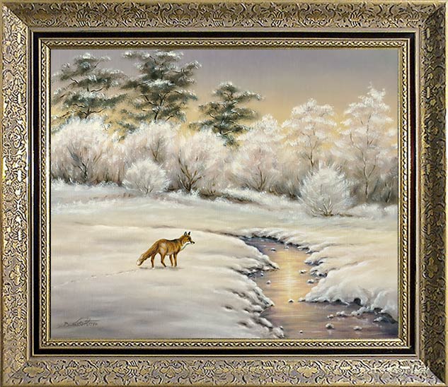 Gemälde-Ausstellung Fuchsgemälde: Fuchs, Winterfuchs, Fuchsbild, Fuchsbilder, Fuchsgemälde, Winter, Schnee, Landschaft, Winterlandschaft, Schneelandschaft, Wintergemälde, Winterbild, Winterbilder, Bach, Bachlauf, Frost, Eis, Eisdecke, Eisschicht, gefroren, zugefroren, Winterbach