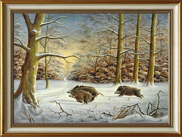 Relevante Schlagwörter zur Umschreibung des dargestellten Gemälde-Typs: Ausstellung beinhaltet Gemälde zu folgenden Themen: Wildschweingemälde, Wildscheine, Wildschwein, Sau, Sauen, Sauenjagd, Treibjagd, Keiler, Schwarzwild, Winterwald, Sauengemälde, Sauenbild, Sauenbilder, Wildschweinbild, Wildschweinbilder, Wildschweinjagd, Suhlen, Suhle, Wildschweinölbild, Wildschweinölbilder, Wildschwein-Ölbild, Wildschwein-Ölbilder, Wildschweinölgemälde, Wildschwein-Ölgemälde, Tiefschnee, Schnee, im, Winter, Gemälde, Bild, Bilder, Ölbild, Ölbilder, Ölgemälde, Jagdmaler, Wildmaler, Tiermaler, Naturmaler, Wildsau, Frischlinge, Frischling, Läufer.